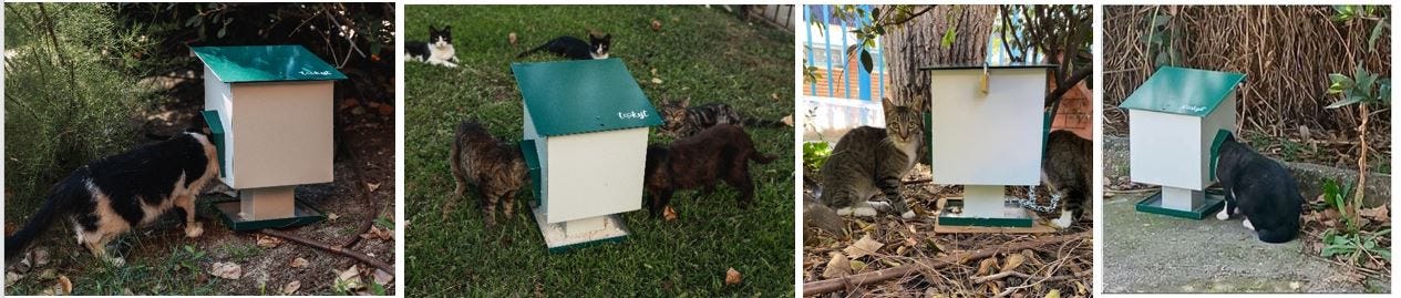 Dispensador con el fin de proteger el alimento, favoreciendo tanto su buena conservación como la higiene del espacio donde viven los gatos. Tokyt es robusto por estar hecho en chapa prelacada, lo que lo hace duradero en el tiempo. Tiene el pienso protegido del exterior y del alcance de los insectos gracias a su base, diseñada para poder poner tierra de diatomeas, repelente natural. La altura a la que se encuentra el pienso es otra de sus virtudes, ya que es la mejor manera de comer para los felinos y de proteger el pienso del suelo. Tiene dos puntos para candar e incluso se puede anclar al suelo. Dispone de dos ventanas para poder comer dos gatos simultáneamente y una capacidad de 5 o 6 kg, dependiendo del tamaño de la croqueta. Pueden encontrar más información sobre el producto en www.tokyt.com y ver experiencias de su funcionamiento en colonias en la cuenta de Instagram @tokyt_cats. No dude en ponerse en contacto si necesita más información, a través del correo info@tokyt.com. |